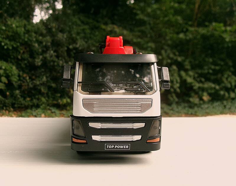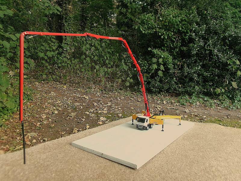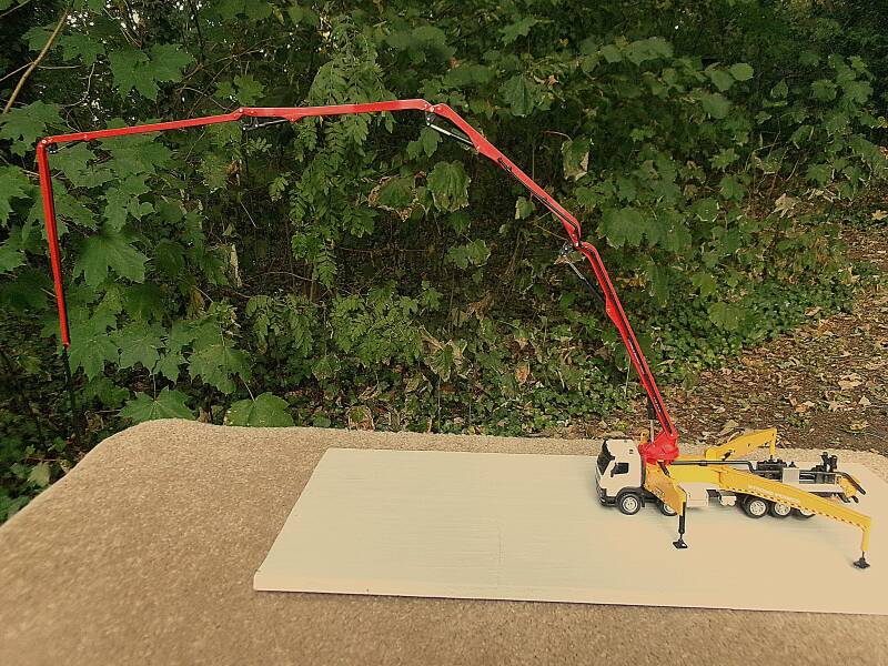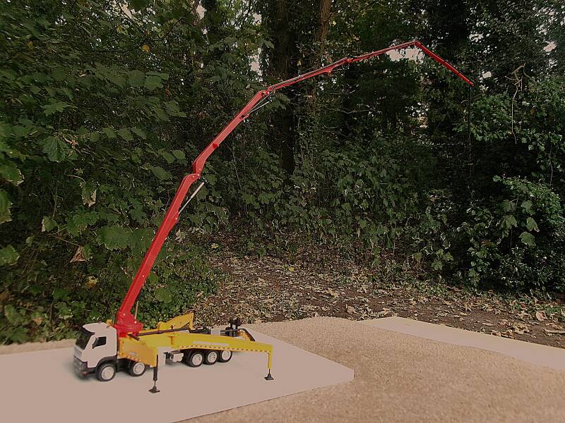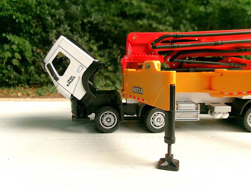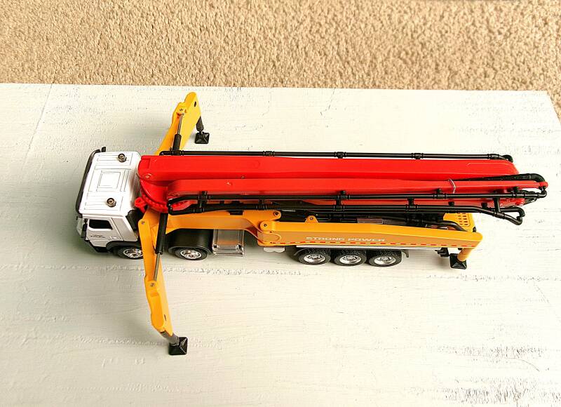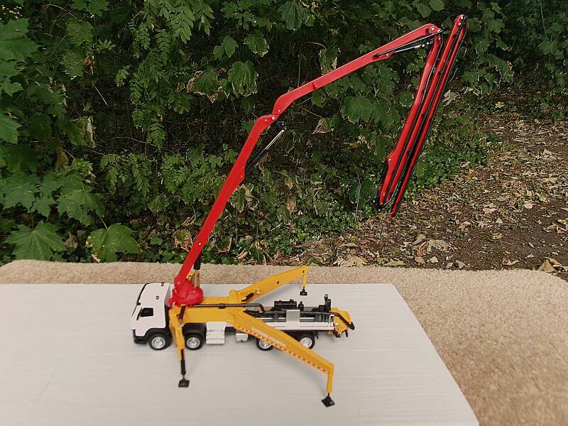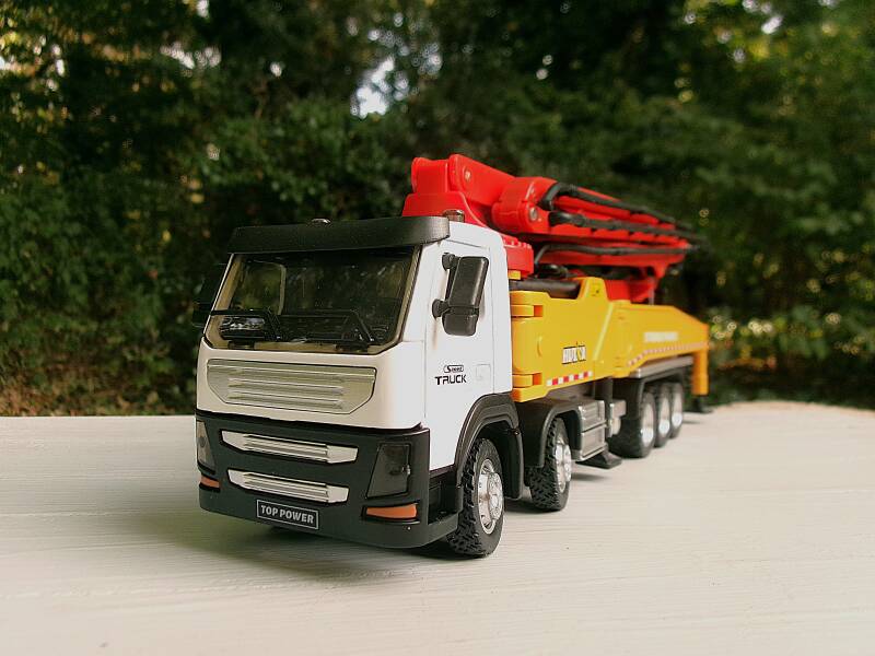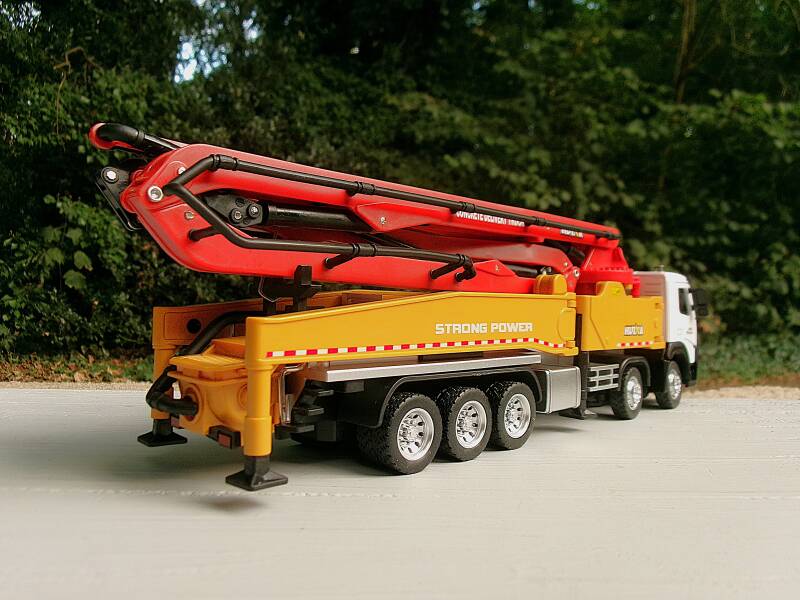 Sany betonpomp op een 5-assige Volvo onderwagen(schaal 1:50, fabrikant Huina Toys). De genoemde merken Sany en Volvo worden op het model niet vermeld, maar alles wijst er op dat het die merken zijn. Hij lijkt namelijk erg veel op de Sany 62M betonpomp van IMC/China, daarom heb ik die merken hierbij vermeld. Wellicht is het model in een groot en ver land nagemaakt en voor kinderen bedoeld. Toch is het een heel mooi miniatuur dat voor de verzamelaar ook voldoet. De prijs valt ook erg mee in vergelijking met die van IMC.
