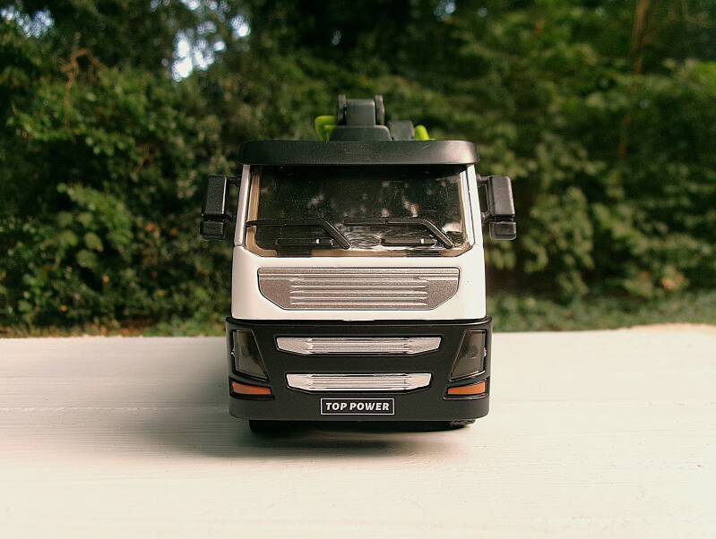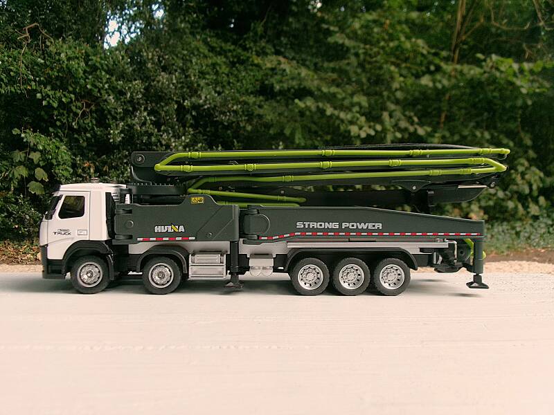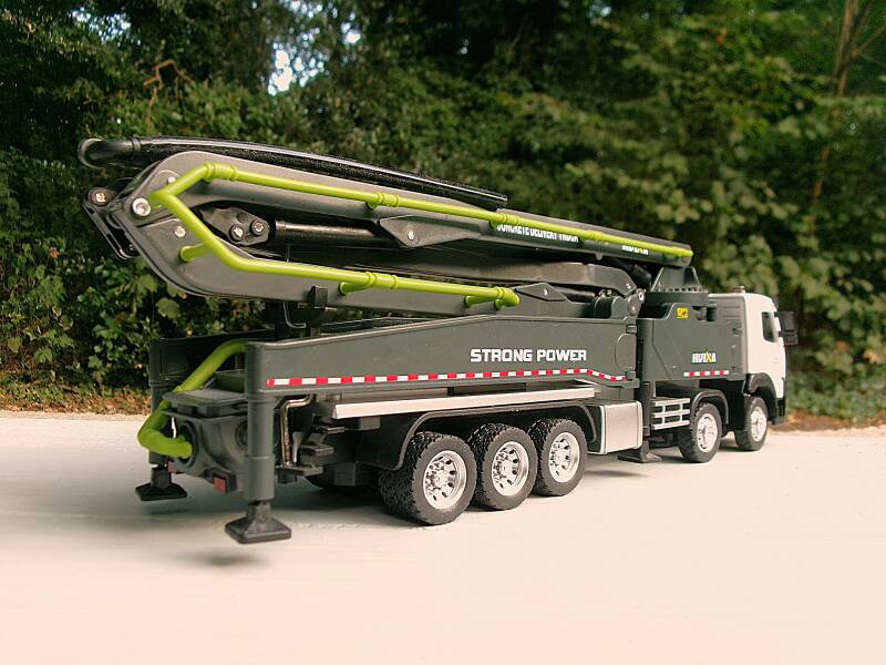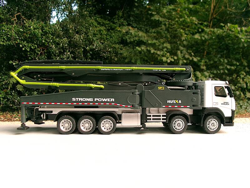 Sany betonpomp op een 5-assige Volvo onderwagen(schaal 1:50, fabrikant Huina Toys). De genoemde merken Sany en Volvo worden op het model niet vermeld, maar alles wijst er op dat het die merken zijn. Hij lijkt namelijk erg veel op de Sany 62M betonpomp van IMC/China, daarom heb ik die merken hierbij vermeld. Wellicht is het model in een groot en ver land nagemaakt en voor kinderen bedoeld. Toch is het een heel mooi miniatuur dat voor de verzamelaar ook voldoet. En de prijs valt erg mee in vergelijking met die van IMC.