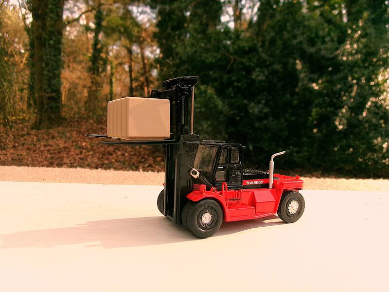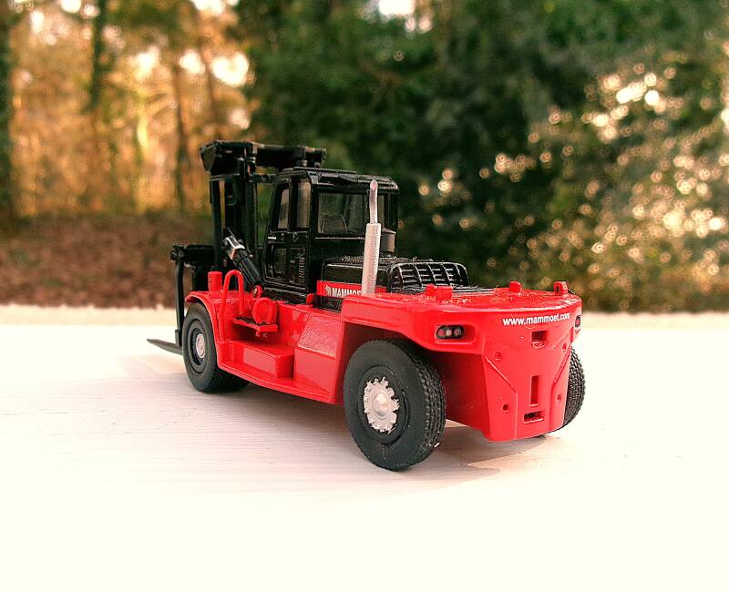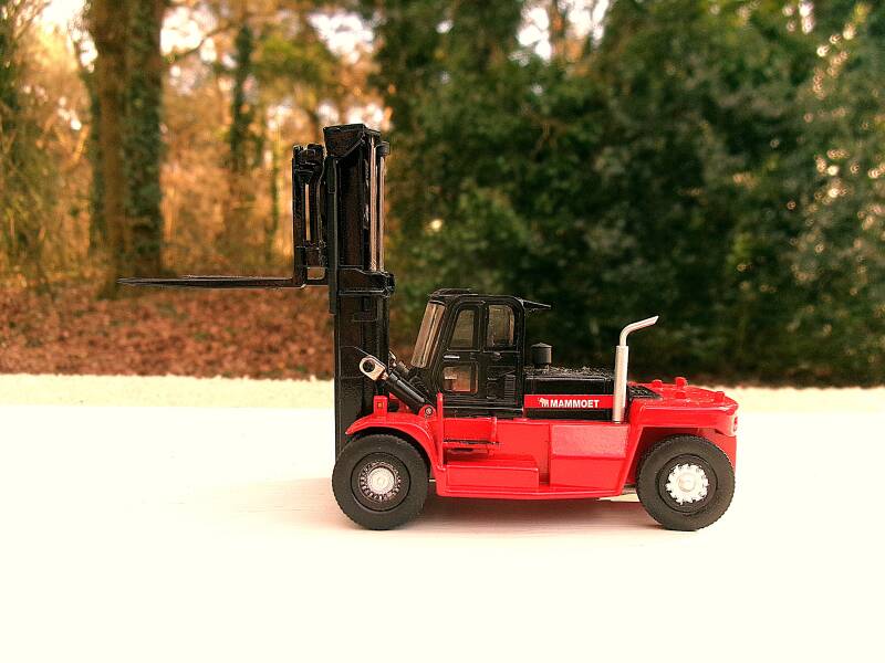 Hyundai 250D-9 vorkheftruck in de kleuren van en met opschrift "Mammoet"(schaal 1:87, fabrikant IMC-Models). Deze heftruck maakt deel uit van de constructieset die IMC heeft uitgebracht van Mammoet. Deze set bevat hiernaast nog een Mercedes-Benz Arocs bakwagen met laadkraan en een Hyundai HX520L rupsgraafmachine.