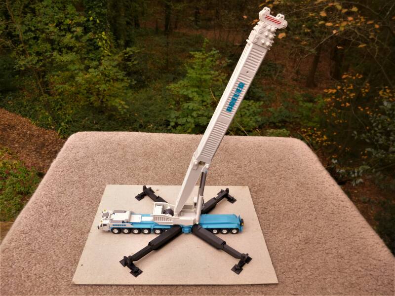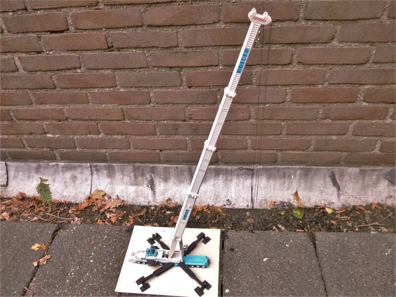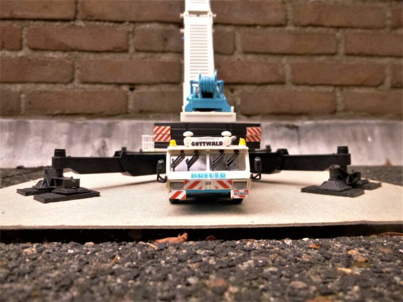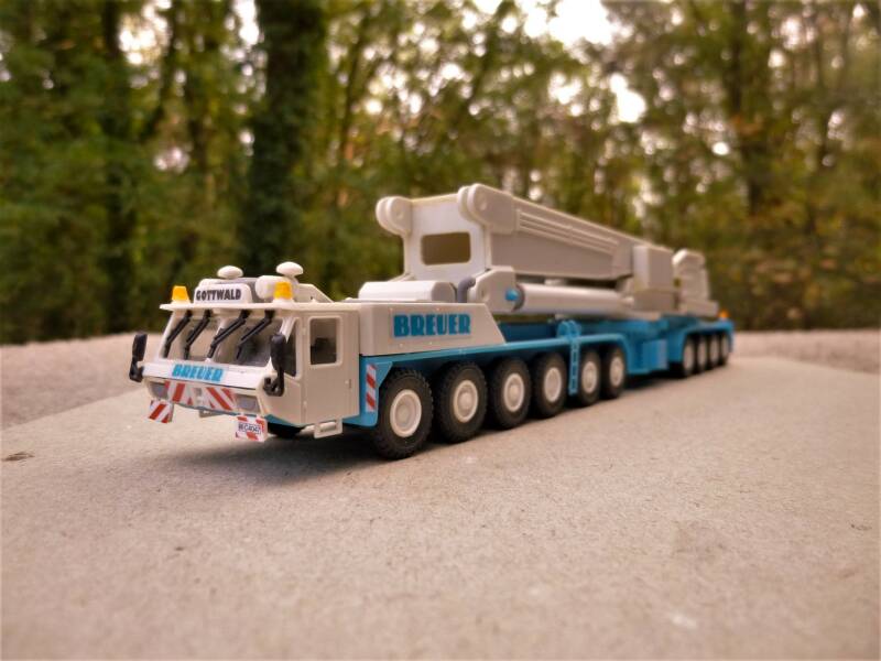 Gottwald AMK1000-103 in de kleuren van en met opschrift "Breuer"(schaal 1:87, bouwpakket, fabrikant Kibri). Deze telescoopkraan werd destijds door Kibri aangeboden in een set samen met 6 transportvoertuigen, waaronder de masttransporter. Iedere truck heeft zijn eigen lading die bestaat uit de contragewichten, stempels, het hijsblok en verschillende delen van de verstelbare jib(verlenggiek).