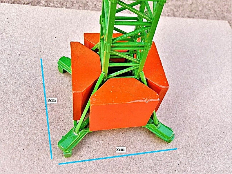 Het is redelijk lastig om zo'n kraan mooi op de foto te kunnen zetten, alleen al door zijn hoogte(ca.1m). Maar de kraan is ook erg instabiel en zeer windgevoelig. Het originele model van Conrad is wel stabieler, omdat de delen van de verticale mast door middel van originele pinnetjes met elkaar zijn verbonden. Die pinnetjes zijn bij dit model bijna allemaal verdwenen. Ik heb dit op proberen te lossen met kleine spijkertjes. Maar zo mooi passend en stevig krijg je hem daar nooit meer mee...