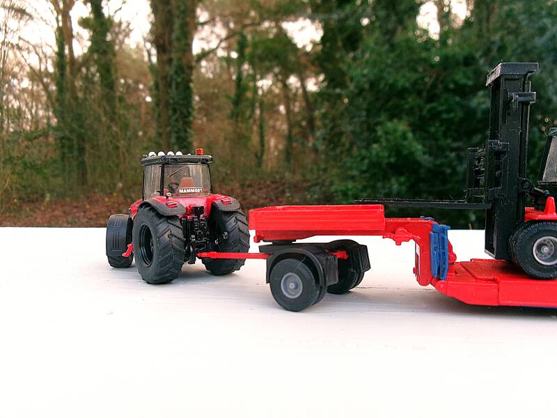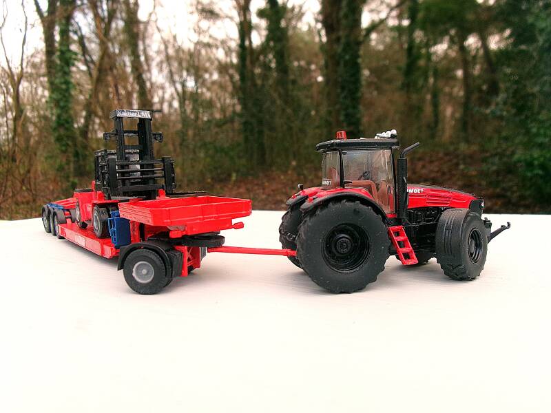 Op een dieplader kun je natuurlijk alles plaatsen, maar om in de hijs-en hefwerkzaamheden te blijven vond ik een heftruck wel mooi om op de dieplader te zetten. Die dieplader vond ik ook op Marktplaats en was een al gebouwd exemplaar van Kibri. Ik heb hem grotendeels rood geschilderd, zodat hij enigszins bij de trekker past. De heftruck heb ik als bouwpakket besteld en in elkaar gezet en ook de zwarte en rode kleuren gegeven. Eerst wat foto's van de mooie gedetailleerde trekker.