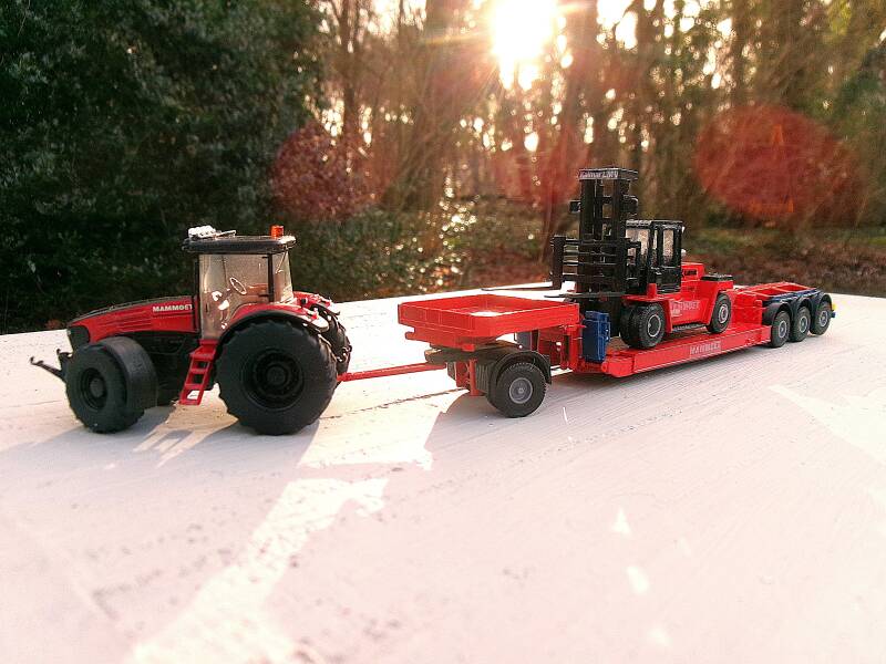 Hier is de combinatie compleet. De kleur rood van de dieplader en heftruck wijkt iets af van die van de trekker, maar het kan er wel mee door vind ik. We nemen gewoon aan dat de trekker het nieuwe Mammoetrood heeft en de dieplader de oude kleur van vroeger.