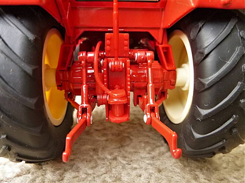 Ook de achterzijde is erg mooi uitgevoerd met hefarmen en een topstang. De trekhaak met pin is in hoogte verstelbaar. In de hef zijn helaas geen machines te hangen, omdat deze niet Siku-compatibel is. Misschien is er een adapter verkrijgbaar, dan kan het wel. Het frontgewicht(rechts) is ook afneembaar.