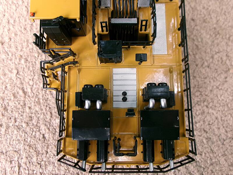 Het cabinedak wordt er los bijgeleverd. Dit doen ze omdat je er dan naar keuze een zittende machinist in kunt plaatsen(volgens het filmpje op Cranes etc., zie links). Maar die machinist zit er bij mijn model niet bij, niet erg want ik denk toch niet dat ik die in de cabine had geplaatst.