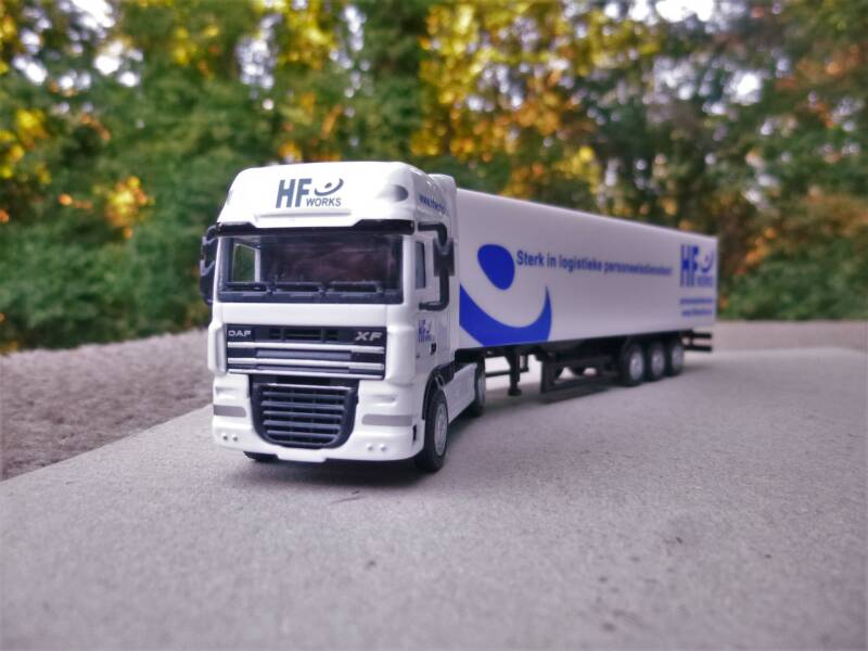DAF XF 4x2 trekker met dichte trailer met opschrift "HF Works"(schaal 1:87, fabrikant Promotoys).