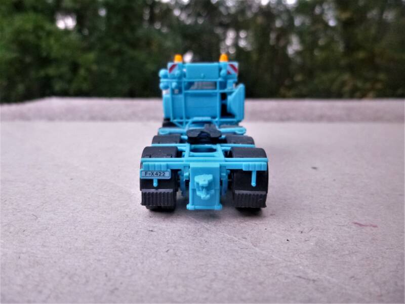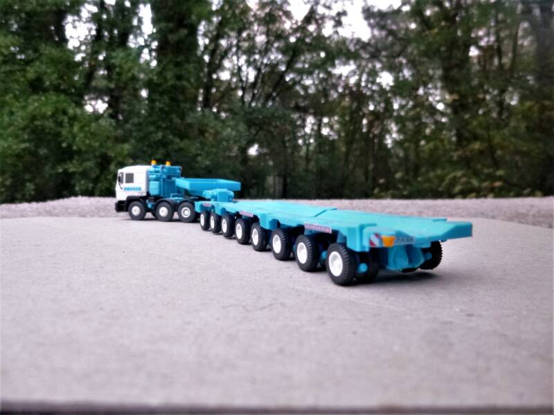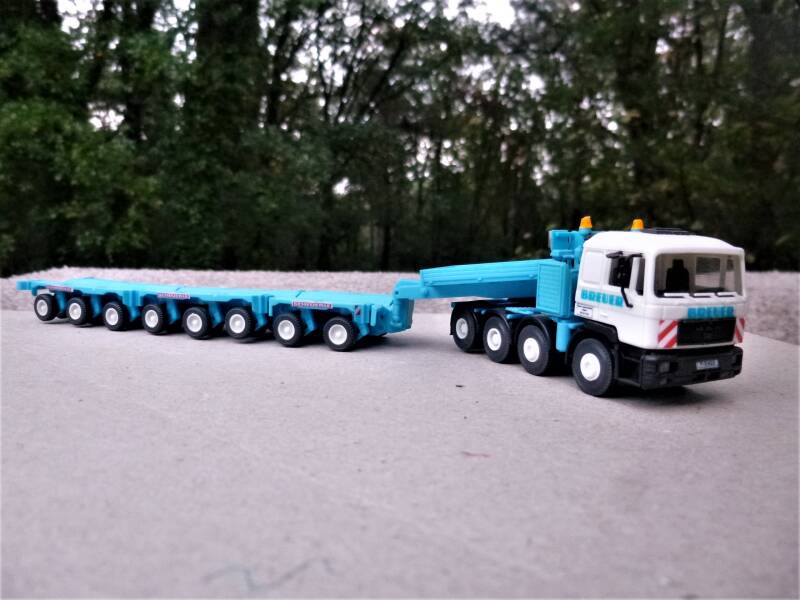 Deze combinatie is onderdeel van de set met 6 transportvoertuigen voor de Gottwald AMK1000-103 telescoopkraan. Omdat deze oplegger een zeer groot laadvermogen heeft is hij zeer geschikt voor het vervoeren van de ballast van de kraan. Ik heb deze combinatie ook afgebeeld samen met de Liebherr LTM1400 telescoopkraan, ook van de firma "Breuer".
