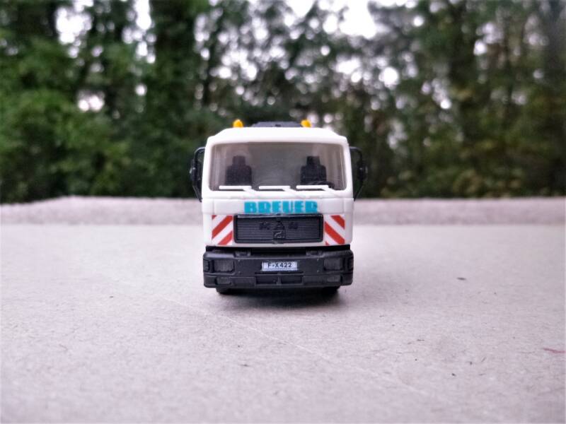 MAN 41.502 8x4 met 8-assige Scheuerle platformdieplader in de kleuren van en met opschrift "Breuer"(schaal 1:87, bouwpakket, fabrikant Kibri).