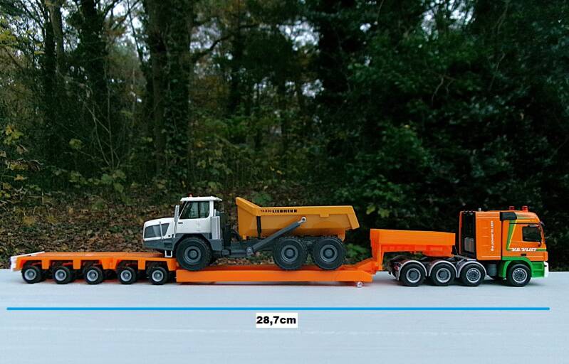 Omdat deze dieplader modulair is kan hij opgebouwd worden door er delen(modules) aan toe te voegen of vanaf te halen naar gelang benodigd is voor de lading. Als er zoals hieronder een Liebherr L583 wielloader vervoerd word kan de dieplader een stuk korter zijn.