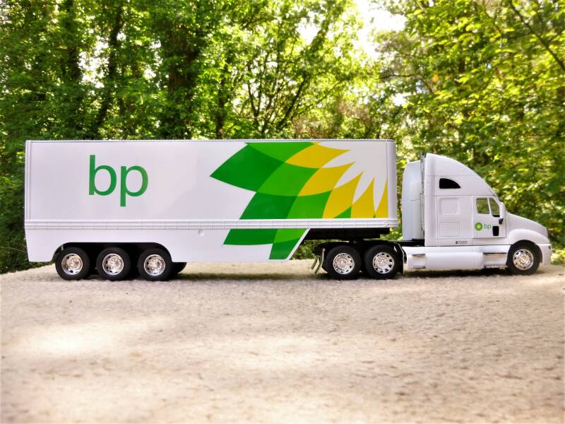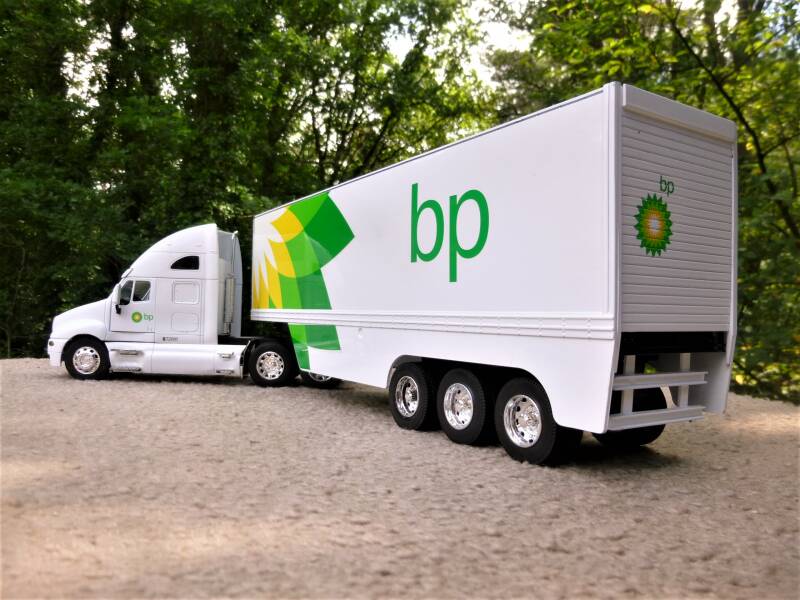 Peterbilt T2000 6x4 trekker met 3-assige dichte trailer met opschriften "BP"(schaal 1:32, fabrikant New-Ray).