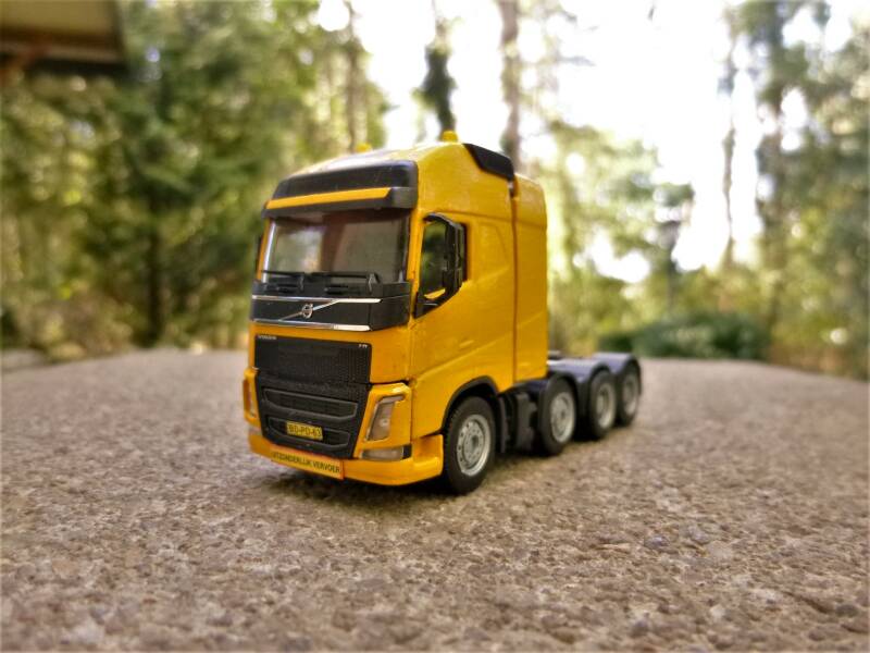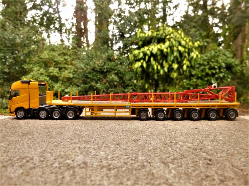 Volvo FH16 8x4 zwaartransporttrekker(schaal 1:87, bouwkit/zelfbouw, fabrikant Herpa). Deze cabine is eigenlijk wit, maar ik heb hem geel geschilderd, omdat ik hem eigenlijk bedoeld heb als combinatie behorend bij de (gele)Liebherr LTM1300-6.2 telescoopkraan, voor het vervoeren van de ballast of de hulpgiek. De Nooteboom ballasttrailer heb ik ook gebouwd en aan deze trekker gekoppeld.
