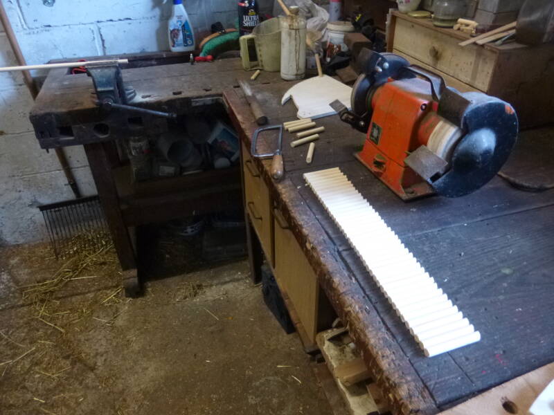 Het maken van de 48 ronde schuine pilaren. Deze heb ik gemaakt van ronde houten stokken van ca.1cm doorsnede, gekocht bij Praxis. Ze zijn ongeveer 9cm lang.