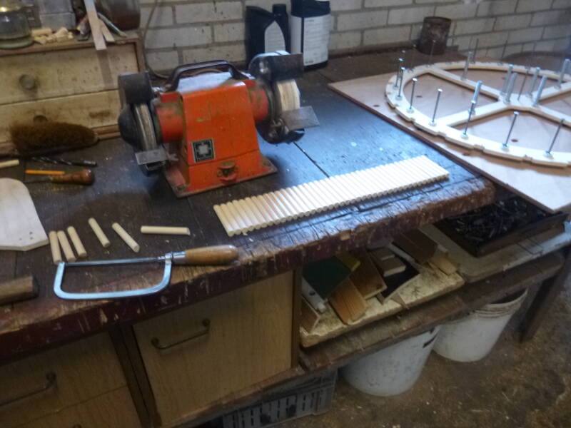 Hier zijn alle 24 staanders uitgezaagd. Met het gebruik van de mal hebben ze dus allemaal dezelfde vorm en kromming.