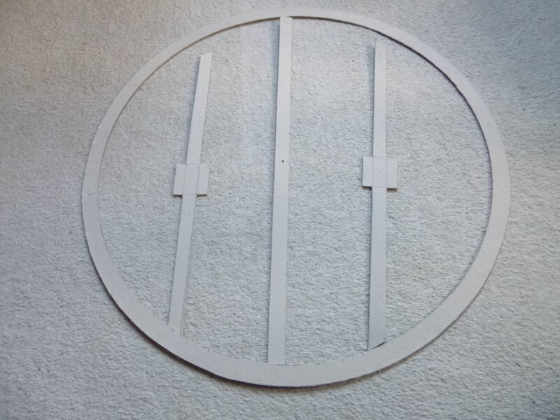 Dan de ruimten tussen de staanders opvullen met 24 stroken stevig papier, verkrijgbaar in grote vellen in de hobbyzaak. Deze stroken heb ik geknipt in een aparte vorm: van onderen breed, dan steeds smaller naar het midden toe om vervolgens weer iets breder te worden tot de top.