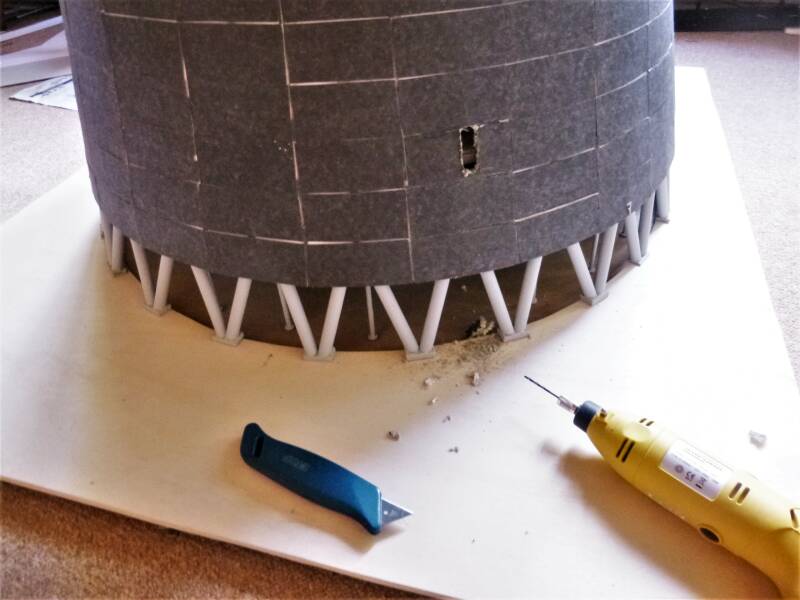 Zo passen de staanders precies in de inkepingen en blijven hier los in rusten. Dit heb ik zo gemaakt, zodat de toren straks los van de voet af kan worden gelicht. Hier heb ik ook de pinnen al aangebracht waar straks alles op rust. Deze komen dus in het waterbassin te staan. Aanvankelijk had ik alle pinnen van draadeinden gemaakt, maar dat was al niet realistisch, te zwak en brak te snel af. Nu heb ik ze allemaal vervangen door grote spijkers waarvan de dikte qua schaal perfect is. Ik heb ook 4 schroeven aangebracht om de toren eventueel waterpas te kunnen stellen.