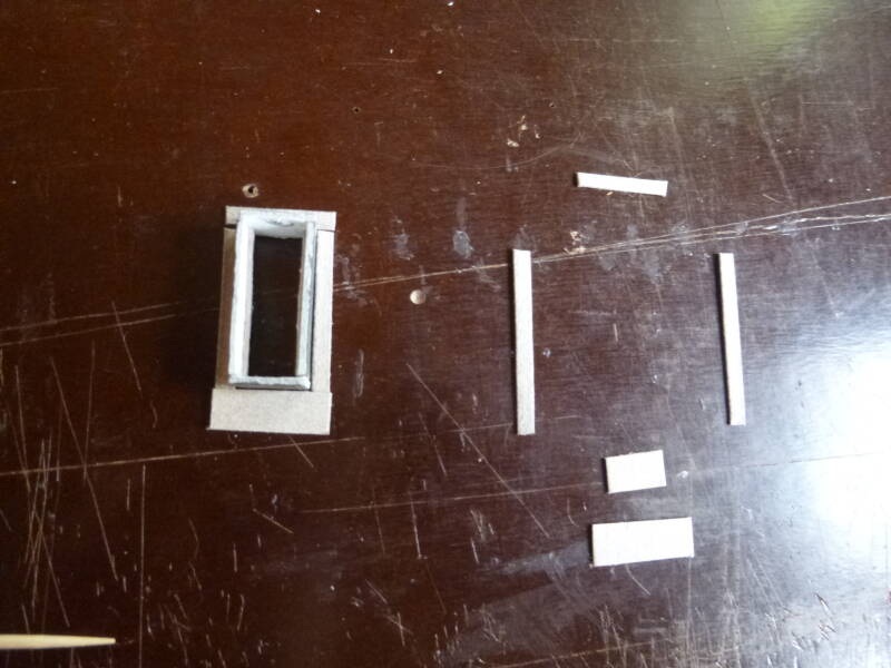 Dat heb ik ook weer gedaan met stukjes karton. Het moest een soort heel breed kozijn worden dat precies past in het gat. En in dat kozijn heb ik twee reepjes geplakt(sponning) waar de deur straks tegenaan komt staan.