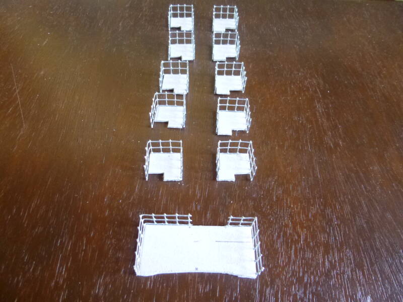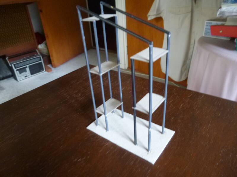 Iedere ladder komt uit in een klein bordes. Deze bordessen heb ik gemaakt met karton en daaromheen weer een reling van gaas.