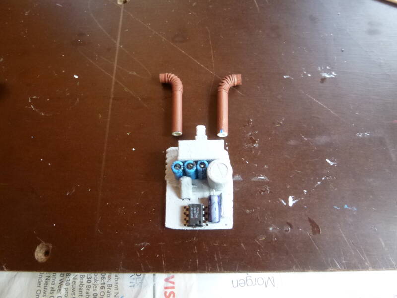 Ik heb ook nog wat pompen met buizen nagemaakt van een printplaatje en wat buigrietjes. Deze staan aan de rand van het waterbassin en de buizen monden dus ook uit in het bassin.