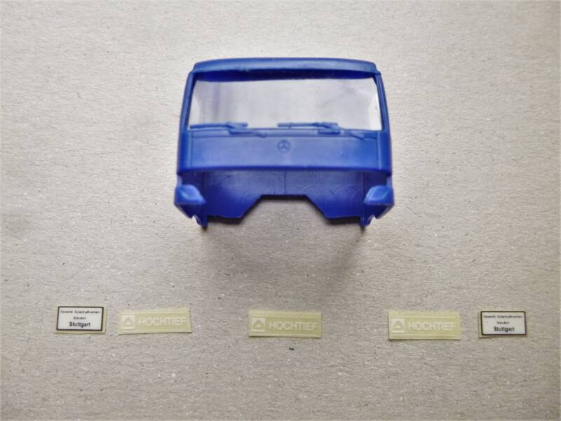Het resultaat, best nog mooi gelukt. Rechts de etiketjes die op de cabine komen. Ik breng ze nu al aan, want de cabine ligt nog plat.