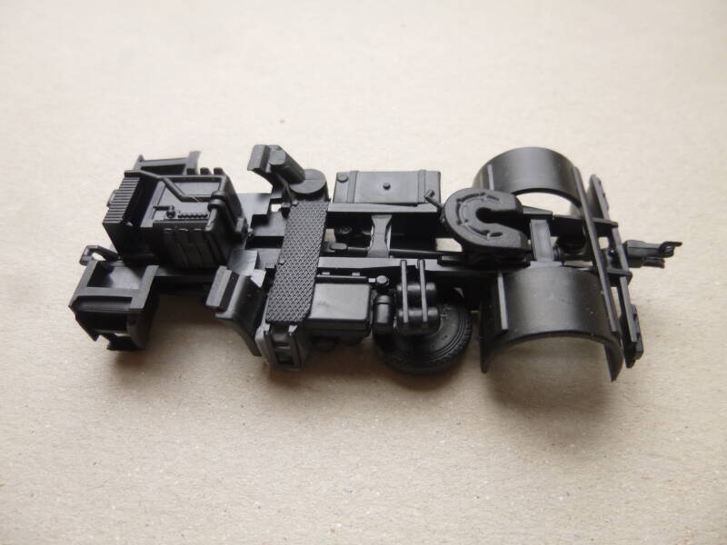 Het onderstel met zijn onderdelen is nu klaar. Rechts nu de bovenkant van het onderstel. Vooraan is het motorblok zichtbaar, verdere onderdelen zijn onder andere het luchtfilter, de brandstoftank, trekhaak en het reservewiel.