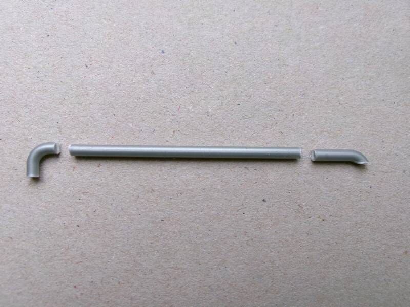 Als eerste ga ik de buis maken die op het dak van de tank ligt. Rechts heb ik het uiteinde zo gesneden alsof de pijp de tank in loopt.