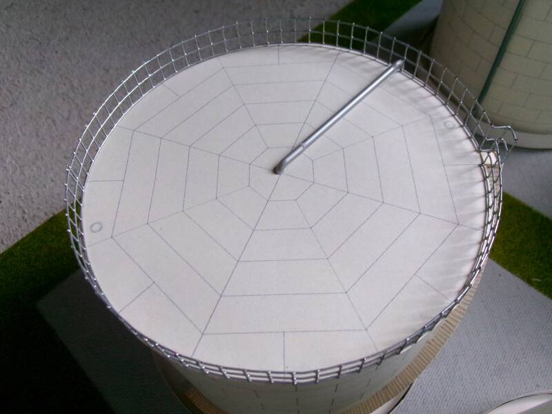 Bij het zoeken naar geschikte emmers, potten of blikken liep ik er steeds tegenaan dat dat het steeds net niet was. Tot ik op Internet een bouwplaat van een opslagtank in H0 tegenkwam, van papier. Deze had volgens de gegevens wel een mooie grote maat(doorsnede ca.15,5cm en hoogte ca. 13,5cm) en is als gebouwd object best wel stevig, weet ik uit (bouw)ervaring. Bovendien is het makkelijk te lijmen en kost het niet veel.