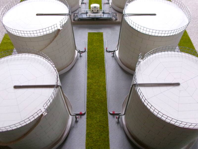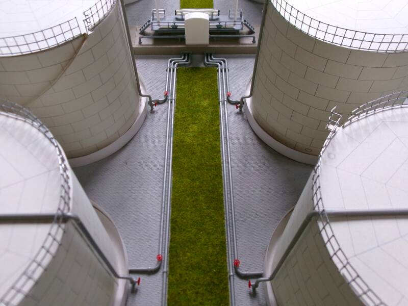Onmisbaar bij een olieraffinaderij zijn de opslagtanks waar de ruwe olie en bewerkte producten in opgeslagen worden. Er staan vaak vele tanks op een rij aan de rand van het complex in alle soorten en maten, van klein tot zeer groot. Deze tanks mogen bij mijn gebouwde raffinaderij dus ook niet ontbreken. Zij zijn voor mijn project de vijfde en tevens laatste uitbreiding van dit project.