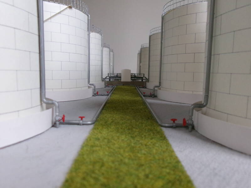 Het buizensysteem van de vier andere tanks heb ik zo gemaakt dat het net lijkt of de buizen de grond ingaan, ze moeten namelijk onder het spoor door(dat straks wordt geplaatst) naar het afvulstation.